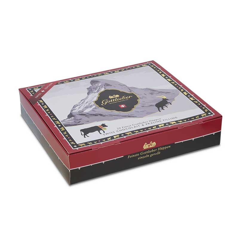 Die Gottlieber Swiss Line im neuen Design - schweizerisch und doch edel! Erstmals mit einer Mischung von zwei köstlichen Hüppen-Füllungen Chocolait (Schweizer Milchschokolade) und Praliné. Im Zentrum dieser neuen Swiss Edition stehen eine Kuh und ein Steinbock, die gemächlich einen Hang, direkt vor der Jungfrau – dem Top of Europe – emporklettern. Die Details wurden sorgfältig mit Goldfolie veredelt. Entstanden ist ein traditionelles Schweizer Geschenk mit einem Hauch von Eleganz.