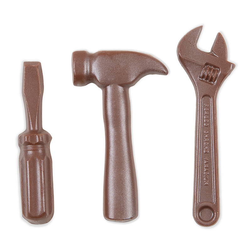 Echte Handwerker benötigen gutes Werkzeug. Für eine leckere Verpflegung zwischendurch sorgt das täuschend echt aussehende Werkzeug Set aus Schokolade klein. Aus leckerer Milchschokolade mit 38% Grand Cru Grenada.