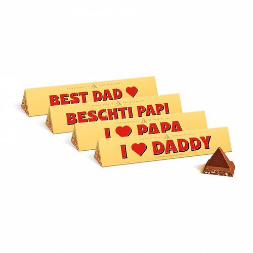 Die unverwechselbare TOBLERONE in der klassischen beigen Verpackung ist eine Kombination aus feinster Milchschokolade mit Honig-Mandel-Nougat. Überrasche deinen liebsten Papa mit den persönlichen TOBLERONE-Botschaften, die es nur exklusiv bei geschenkidee.ch in drei verschiedenen Sprachen und mit unterschiedlichen Designs gibt. Die Aufschrift ist übrigens auf eine zusätzliche Extra-Verpackung gedruckt, welche man als schönes Andenken behalten kann. Ein unverwechselbarer Genuss mit jedem Zacken!