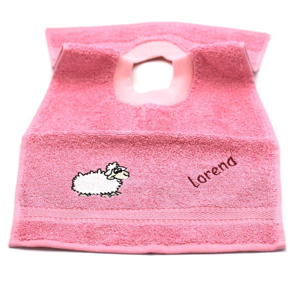 Der pinke Schlupflatz aus saugfähigem Baumwollfrotté verhindert, dass Flüssigkeiten auf die Kleidung gelangt. Der Latz mit dem Schäfchen-Motiv ist äusserst schnell übergezogen und hält sehr gut an Ort und Stelle. Dank des flauschigen Materials ist der Tragekomfort sehr hoch für Babys. Der Schlupflatz kann mit dem Namen oder dem Wort deiner Wahl bestickt werden und ist aus diesem Grund ein einzigartiges Geschenk zur Geburt oder zur Taufe.