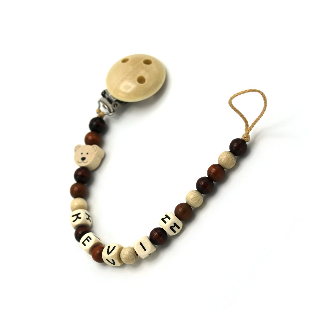 Wunderschönes und originelles Geschenk zur Taufe und Geburt. Die Nuggikette mit dem Motiv Bär kann mit jedem Wunschnamen oder Wort von bis zu 10 Zeichen personalisiert werden. Die edlen Holzperlen sind speichelfest und werden von Hand aufgefädelt. Der praktische Clip ist mit drei Ventilationslöchern ausgestattet, damit die Luftzufuhr des Babies jederzeit gewährleistet ist. Die Kette ist 22cm lang.