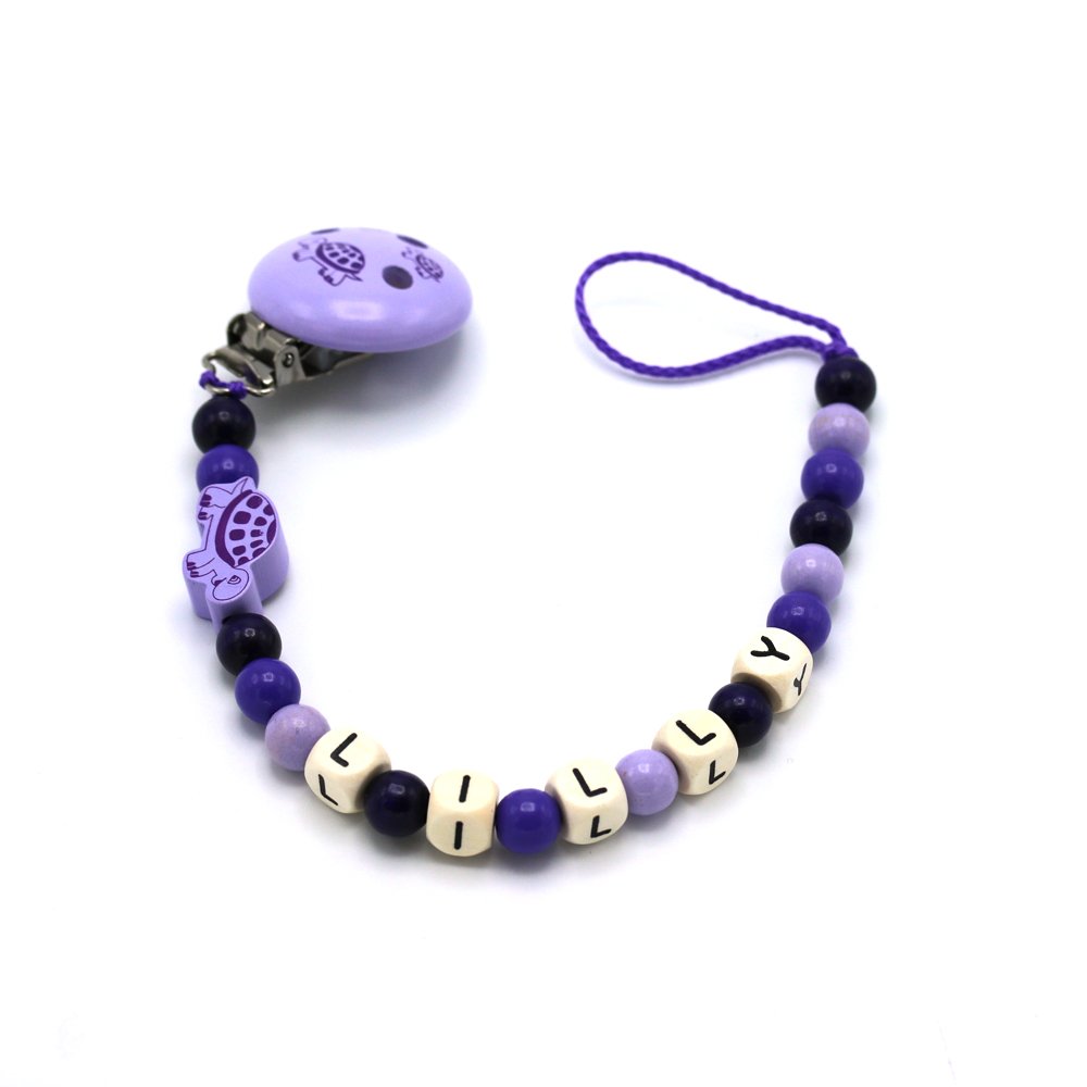 Die Nuggikette mit dem Schildkrötenmotiv besteht aus Holzperlen in verschiedenen Lilatönen. Die Nuggikette kann mit jedem Wunschnamen oder Wort von bis zu 10 Zeichen personalisiert werden. Von Hand werden die gewünschten Buchstaben-Holzperlen eingefädelt - aus speichelfestem und giftfreiem Holz. Ein nützliches und trotzdem originelles Geschenk zur Geburt oder zur Taufe.