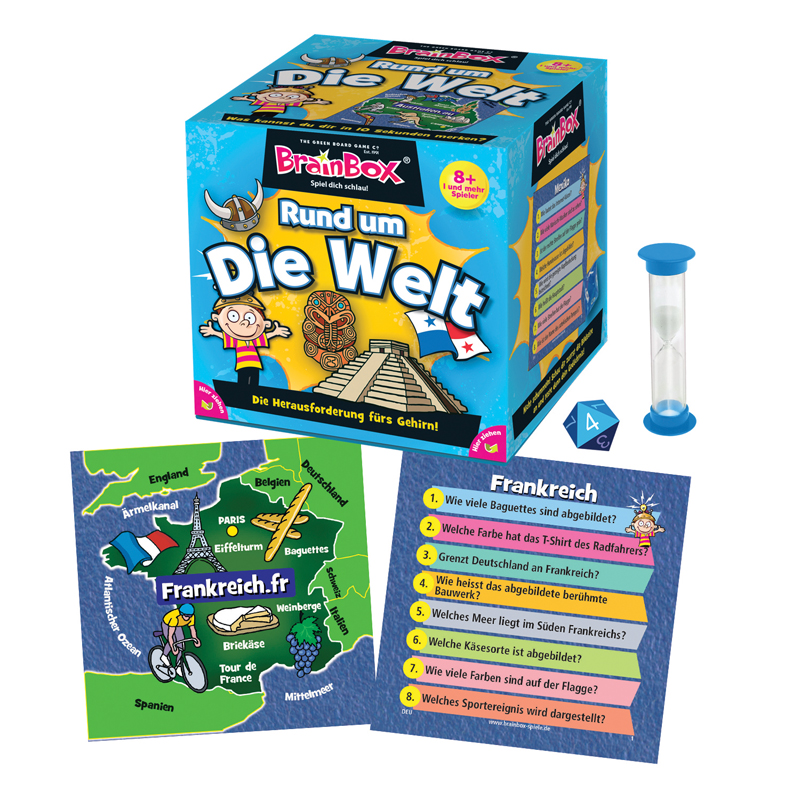 Mit diesem genialen Lernspiel von Brain Box erweitern nicht nur Kinder ihren Horizont und verbessern ihre Allgemeinbildung. Auch der ein oder andere Erwachsene wird bei der Wissensabfrage des Schützlings bestimmt noch etwas dazulernen. Das Kind lernt auf spielerische Weise die Hauptstädte, Nachbarländer und Landesflaggen kennen, was nicht nur im Erdkundeunterricht von Vorteil ist. Das kunterbunte Spiel ist für Kinder ab 8 Jahren geeignet und lässt sich dank der kompakten Grösse auch ideal mit in den Urlaub oder auf einen Ausflug nehmen. Ob zum Geburtstag oder als Mitbringsel zu einer Kinderparty: Das "Rund um die Welt-Spiel" sorgt für jede Menge Abwechslung und punktet mit seinen liebevoll gestalteten Lernkarten.