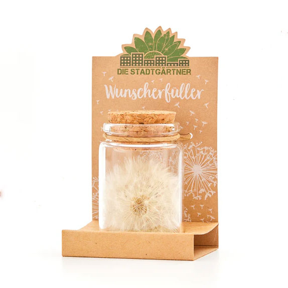 Willst du einem lieben Menschen etwas Gutes wünschen oder bist du auf der Suche nach einer Alternative zu Grusskarten? Dann ist der Wunscherfüller Pusteblume im Glas das richtige Geschenk, um einen Wunsch zu verschenken. Dank dem Wunscherfüller im Glas musst du nicht mehr stundenlang auf einer Blumenwiese nach Löwenzahn Ausschau halten und die Pusteblumen auspusten, sondern kannst ganz unkompliziert einen Wunsch verschenken, als Geburtstagsgeschenk, zur Hochzeit, als Glücksbringer oder einfach so.