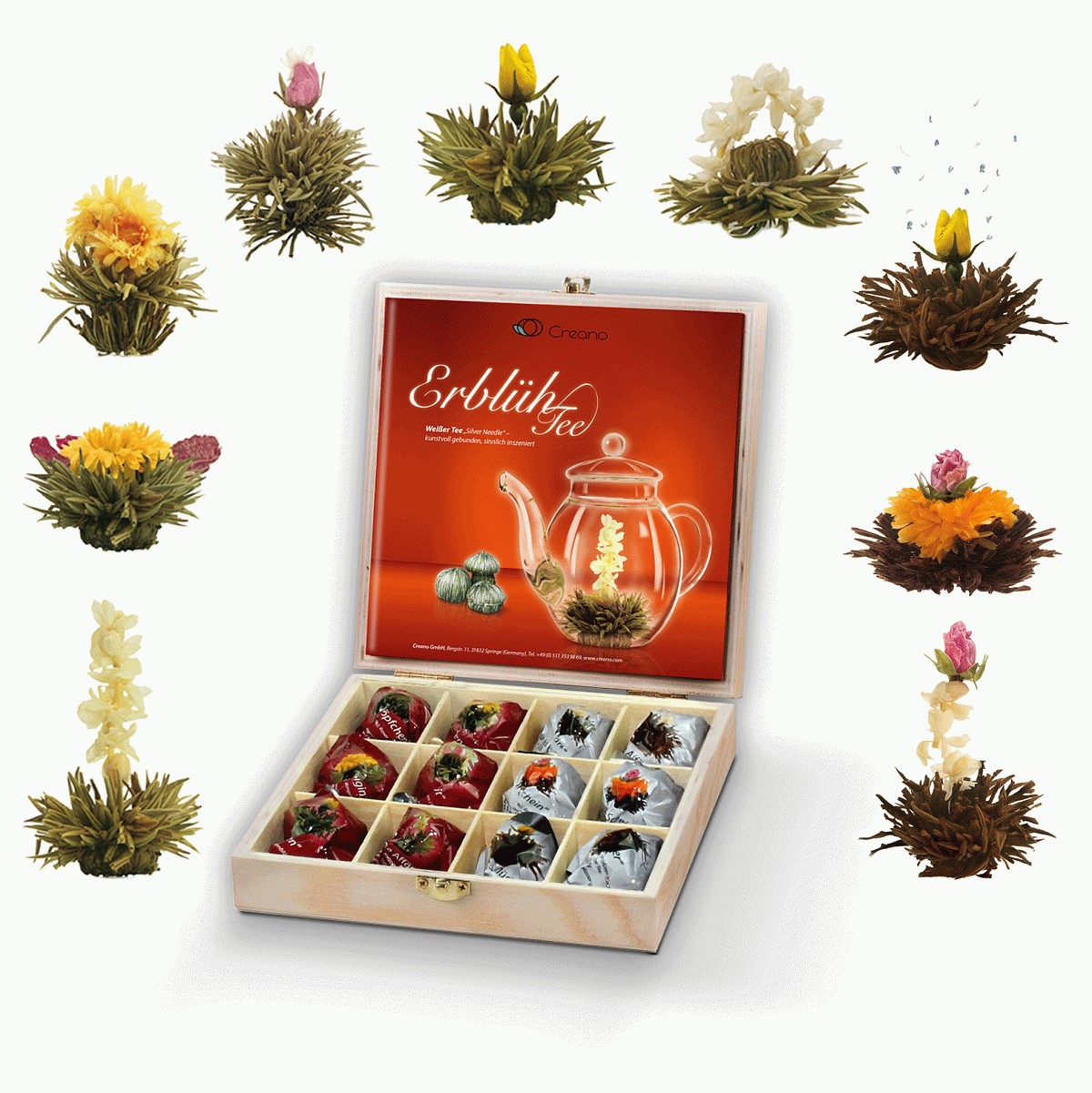 Im Innern der Erblüh Tee-Kugeln befindet sich eine kunstvoll eingebunde exotische Blüte, welche sich entfaltet, sobald du die Kugel in heisses Wasser gibst. Sie öffnet sich langsam und bringt die eingebette Blüte hervor. Die Blüten werden in China traditionell in Handarbeit hergestellt. Der Erblühtee ist eine wertvolle Rarität Chinas, da nur wenige Leute wissen, wie die Kugeln gebunden werden müssen. Diese edle Holzvix enthält Tee-Kugeln in 9 Variationen: 6 Sorten Weisser Tee und 3 Sorten Schwarztee. Die Box enthält 12 Kugeln, 6 Kugeln Weisser Tee und 6 Kugeln Schwarztee. Es sind 2-3 Aufgüsse möglich, wobei die Geschmacksintensität dabei immer variiert.