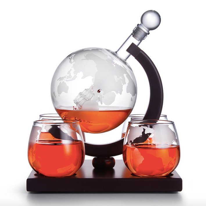 Ein erstklassiges Getränk muss auch besonders hochwertig aufbewahrt werden. Diese Glaskaraffe verwandelt mit dem aussergewöhnlichen Globus Design jeden Wohnbereich in einen eleganten Blickfang und dient als exquisite Zimmerdekoration. Deine Gäste werden von der stilvollen Weltkarten-Optik beeindruckt sein und von diesem Dekanter schwärmen! Ausserdem wird der Globus mit einem Segelschiff im Innern abgerundet und macht somit das perfekte Geschenk für leidenschaftliche Weltenbummler. Die 4 enthaltenen Trinkgläser ergänzen sich wunderbar zur Karaffe und komplettieren den Trinkgenuss. Ideal geeignet für einen Geburtstag oder Vatertag.