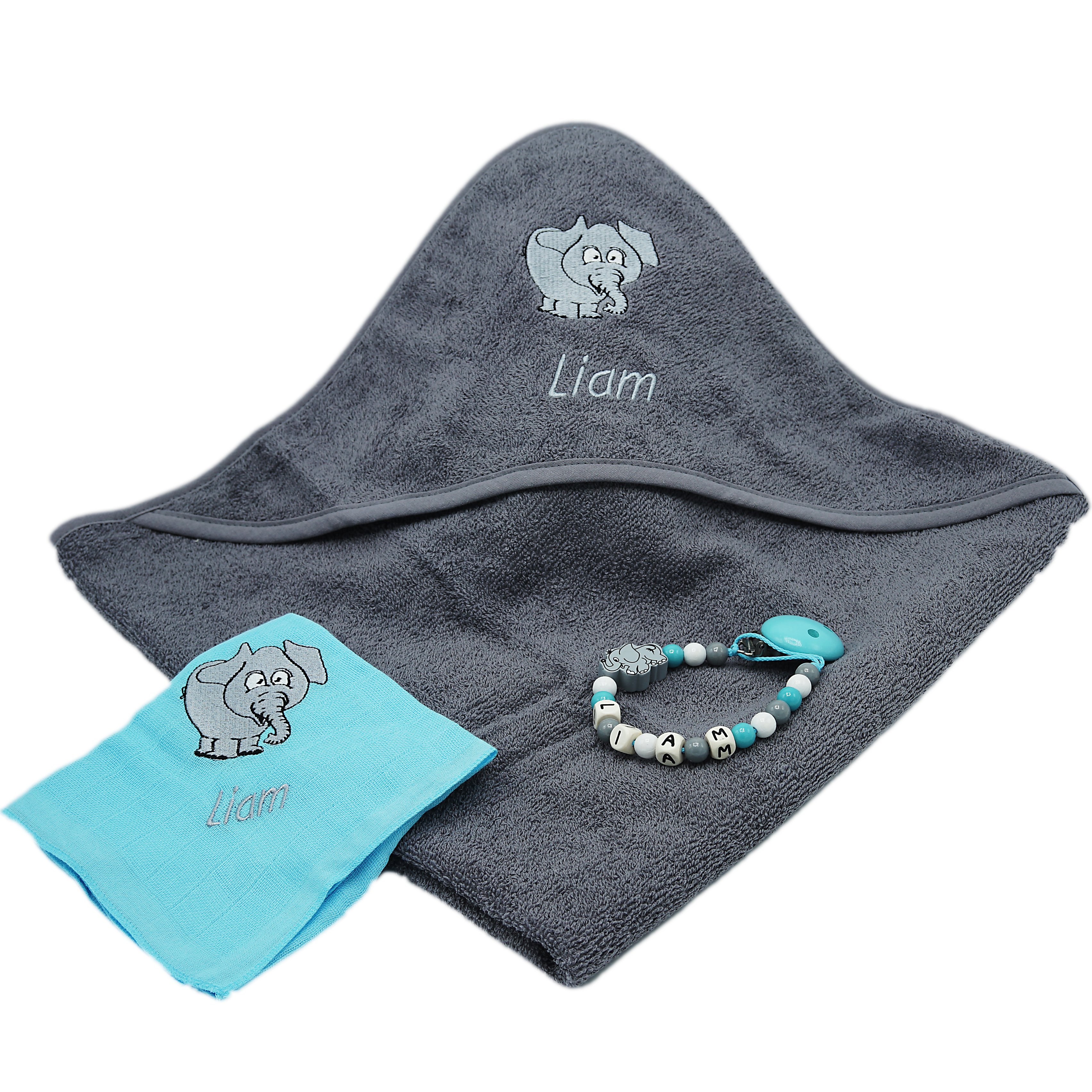 Personalisierbares Geschenkset Elefant, mit Badetuch, Nuscheli & Nuggikette
