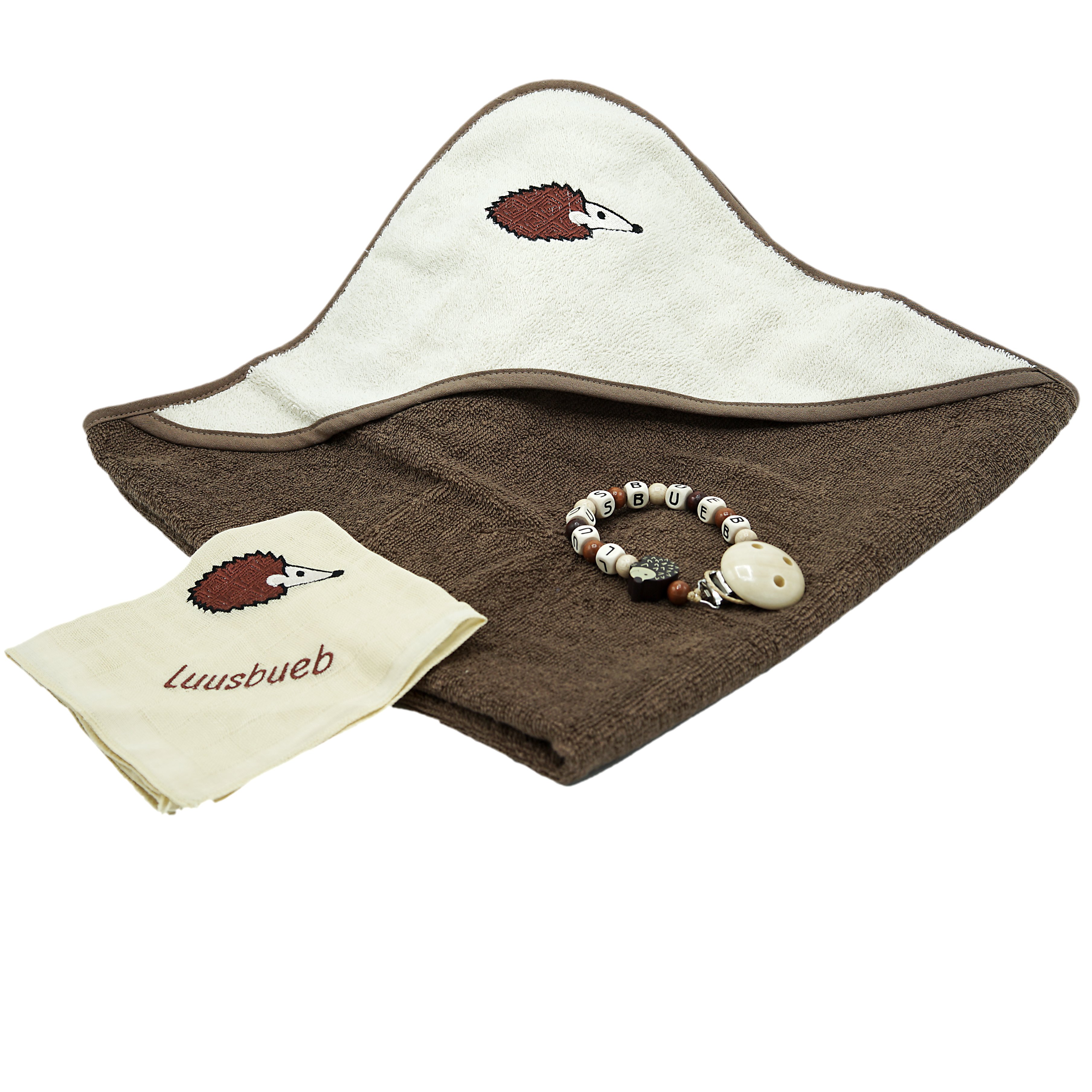 Personalisierbares Geschenkset Igel, mit Badetuch, Nuscheli und Nuggikette