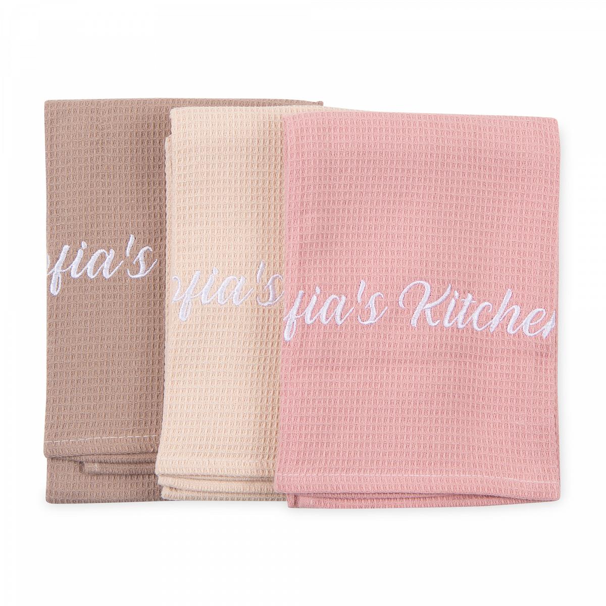 Dieses hübsche Küchenhandtuch-Set kommt in den zarten Farben rosa, weiss und beige. Strapazierfähig, saugfähig und pflegeleicht - sie sind perfekt geeignet für den Einsatz beim Geschirr trocknen. Und damit ab sofort jedem klar ist, wem diese stylischen Küchentücher gehören, kannst du sie mit einem Text deiner Wahl personalisieren lassen. Dank der schönen Schrift passen die Küchenhandtücher wundervoll in eine stilvolle Küche.