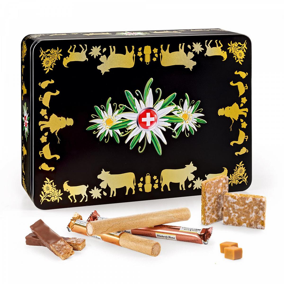 Verschiedenste Läckerli Huus Spezialitäten verbergen sich in dieser Edelweiss Dose. Original Basler Läckerli, feine Rahmtäfeli, Basler Läckerli au chocolat lait und assortierte Flûtes de Bâle werden deinen Gaumen verwöhnen. Die wunderschöne Dose mit hochgeprägtem Edelweiss-Motiv ist umrundet mit traditionellen Details und schimmernden Goldtönen. Ein umwerfendes Geschenk, welches mit den köstlichen Spezialitäten für einzigartige Genussmomente sorgt.