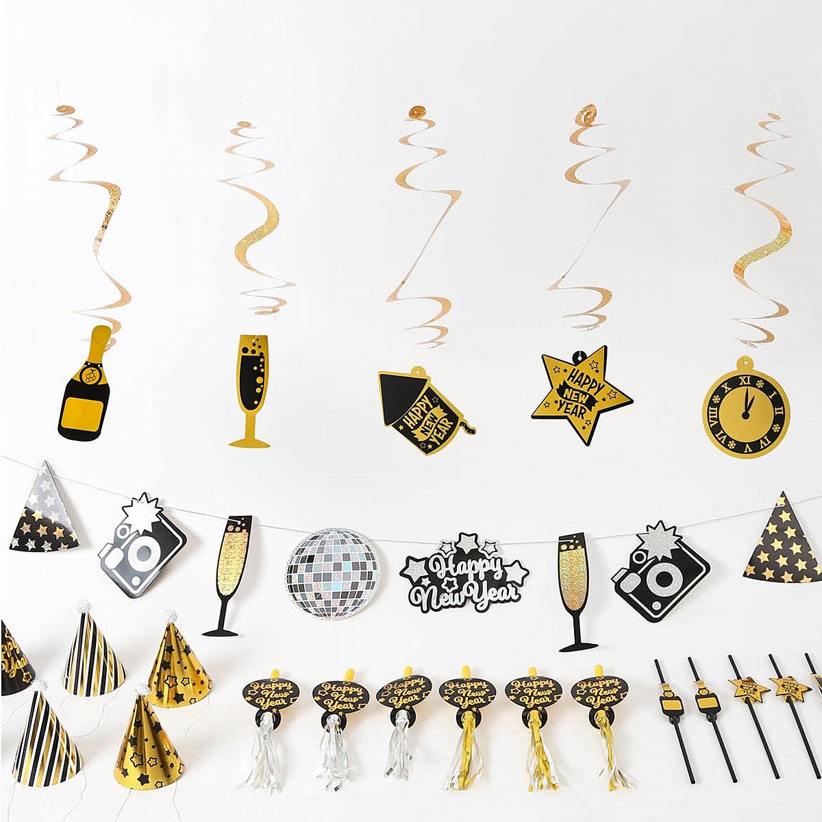 Glänzend, hübsch und glamourös! Dieses Neujahrs-Dekorationsset wird die Party mit den glanzvollen Elementen ganz schön aufpeppen. Partyhüte, Trinkhalme, goldene Girlanden, Aufhänger und Pfeifen werden für ein feierliches Ambiente sorgen. Verwandle die Silvester-Party in ein aufregendes Erlebnis mit diesem Set!