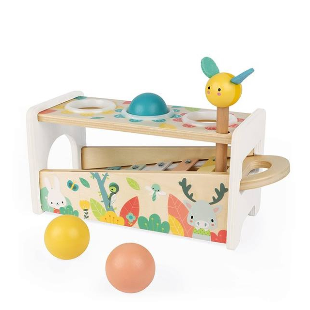 Fördere die Geschicklichkeitsfähigkeit deines kleinen Lieblings mit diesem putzigen Schlagspiel von der Marke Janod! Die schöne Holzbox ist mit angenehmen sowie zeitgemässen Farben und süssen Tieren versehen. Das 2-in-1 Geschicklichkeitsspiel fördert dabei die Fingerfertigkeit auf lustige Weise. Mit dem Bienenhammer kann dein Liebling auf die 3 Bälle schlagen, die dann auf die Tasten des Xylophons fallen und dieses erklingen lassen. Das Xylophon lässt sich ganz einfach herausnehmen und kann überall bespielt werden!