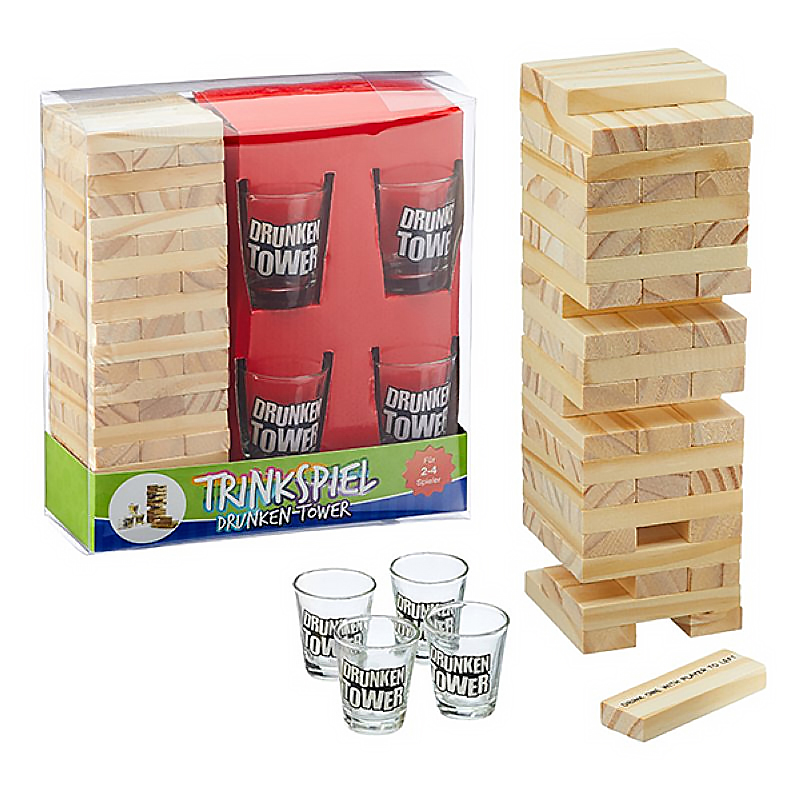 Der Spieleklassiker gibt es jetzt auch als lustige Partyversion! Versuche die einzelnen Holzsteine der Reihe nach aus dem Turm zu ziehen, um sie oben geschickt wieder aufzulegen. Bricht der Turm jedoch zusammen, muss der Verlierer ein Shot Glas leeren!
