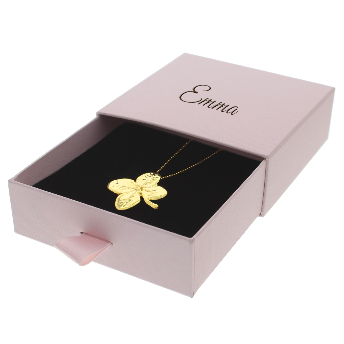 Der bezaubernde Kleeblatt-Anhänger wird zum persönlichen Glücksbringer! Vergoldet und in edlem rosafarbenem Etui verpackt, kann das schöne Schmuckstück zu verschiedenen Anlässen verschenkt werden. Mit einer individuellen Personalisierung verwandelst du den Anhänger in ein persönliches und einzigartiges Geschenk. Die längenverstellbare Kette ist besonders für Allergiker geeignet, da sie nickelfrei und mit 24 Karat Gold beschichtet ist. überbringe symbolisch deine besten Wünsche an den oder die Beschenkte*n!