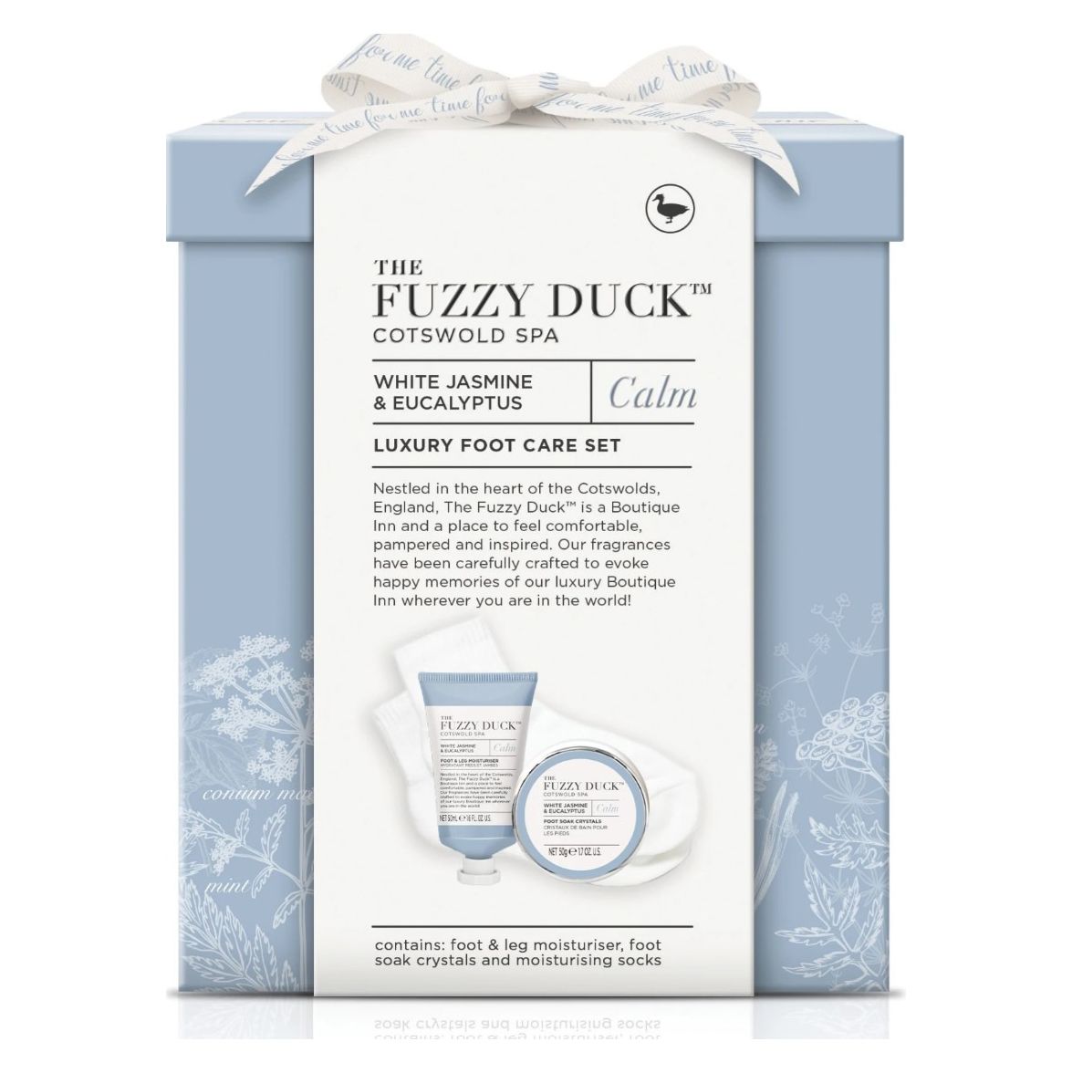 Mit dem Fusspflegeset von der Marke Fuzzy Duck kannst du dein Zuhause in ein Wellness verwandeln! Lasse dich dabei von dem Duft von herrlichem weissen Jasmin und Eukalyptus verwöhnen. Die reichhaltigen Inhaltsstoffe der Fusscreme pflegen spröde sowie rissige Fusssohlen. Die bequemen Baumwollsocken kannst du danach zum Schutz anziehen, damit die Creme vollständig einziehen kann. Durch die edle Verpackung wird das Set zum perfekten Geburtstags- oder Weihnachtsgeschenk!