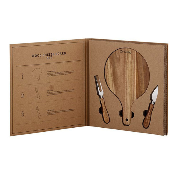 Dieses Käse-Set ist das ideale Geschenk für jeden Käseliebhaber. Die einzigartige Kartonverpackung sorgt für einen besonderen Hingucker. Das Set enthält ein Schneidebrett aus robustem Akazienholz und Käsebesteck zum Schneiden. Das paddelförmige Schneidebrett mit seiner reich gemaserten und dichten Oberfläche ist die perfekte Grundlage für das Schneiden und Servieren von Käse. Mit diesem Set das man Personalisieren kann, wird das Käseschneiden zum Erlebnis!