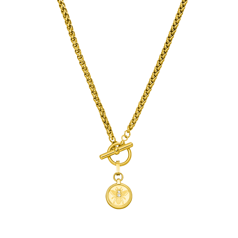 Die Purelei Lele Kette mit der wunderschönen Gravur im Bienen-Design ist ein super Basic Schmuckstück für tolle Kettenkombinationen. Der Anhänger ist an einen Knebelverschluss angebracht und mit zwei Schmucksteinen besetzt, wodurch dieses Schmuckstück das i-Tüpfelchen ist, welches Ihr Outfit komplett macht. Ideal für Tage geeignet, an denen man ein Statement setzen möchte.