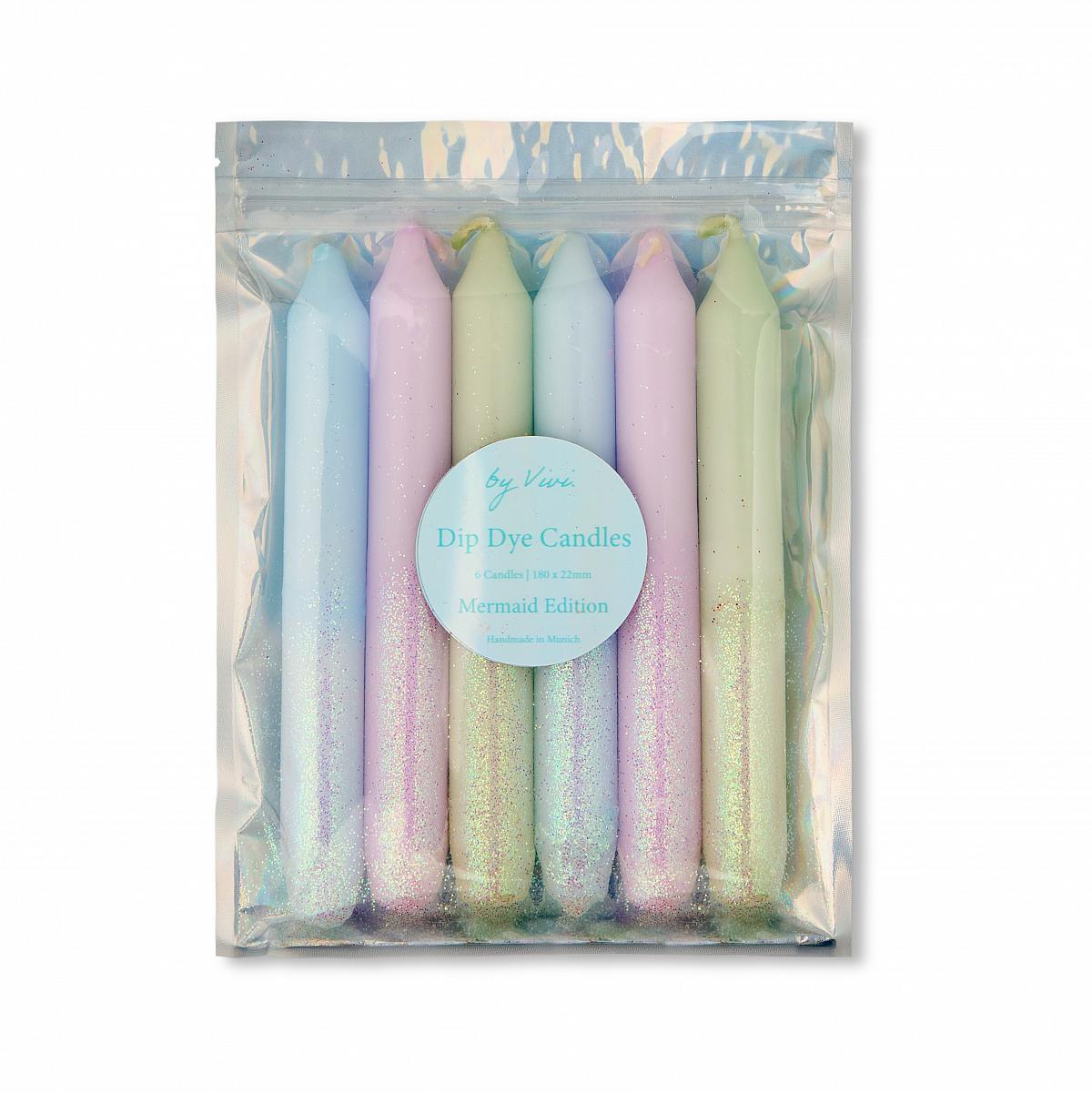 Das Kerzen-Set Mermaid ist das ideale Geschenk für jeden Anlass. Die handgefärbten Dip Dye Kerzen sind einzigartig und wurden mit viel Liebe in München gefertigt. Jede Kerze ist ein Unikat und verzaubert mit einem Farbverlauf und Glitzereffekt. Das Set besteht aus 6 Kerzen mit einer Brenndauer von jeweils ca. 6,5 Stunden und wird in einer wiederverwendbaren Verpackung geliefert.
