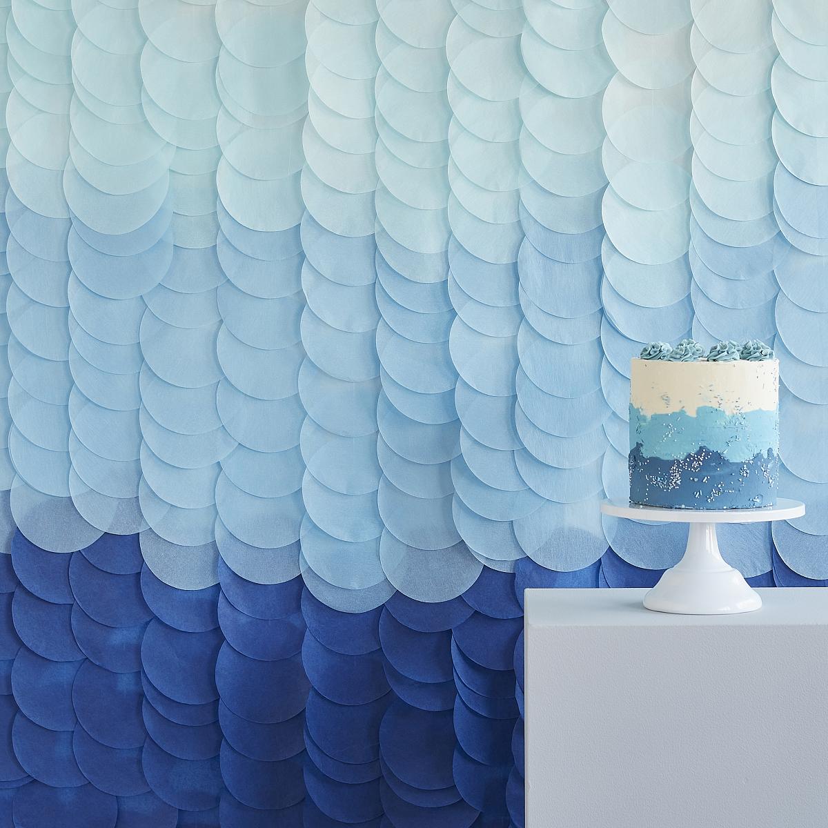 Wenn Sie einen schönen Hintergrund benötigen, können Sie den Blaue Ombre Seidenpapierscheibe Partyhintergrund verwenden. Der Vorhang erstreckt sich über eine Fläche von 2m x 2m und besteht aus 18 Strängen, die in einem Farbverlauf von Hellblau bis Dunkelblau gehalten sind. Egal ob als atemberaubende Partydekoration, als Hintergrund für das Buffet oder als Kulisse für Fotos - dieser Vorhang verleiht Ihrer Dekoration garantiert einen besonderen Touch.