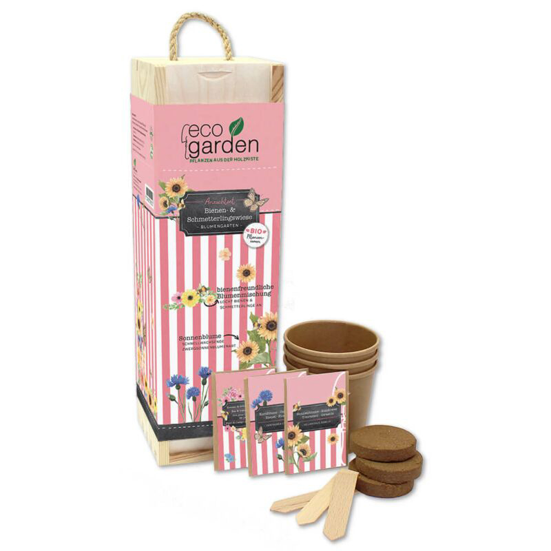 In diesem Set EcoGarden Bienen - & Schmetterlingswiese erwartet Sie ein blühendes und summendes Paradies. Die enthaltenen Blumensamen werden zu einem wunderschönen Blumenmeer heranwachsen, das von zahlreichen Bienen und Schmetterlingen besucht wird. Die kompakte Holzbox benötigt nur wenig Platz und eignet sich perfekt für Fensterbänke oder Balkone. Tauchen Sie ein in diese farbenfrohe Welt der Natur!