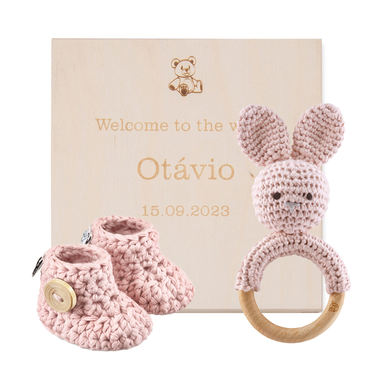 Bereite den Kleinsten eine zauberhafte überraschung mit diesem bezaubernden Geschenkset. Sorgfältig zusammengestellt aus unseren Bestsellern für Babys, findet sich alles in einer hübschen Holzkiste wieder. Diese personalisierbare Kiste erfüllt nicht nur einen praktischen Zweck als Stauraum, sondern wird später auch zur Aufbewahrung von Erinnerungsstücken dienen. Das Set umfasst niedliche Babyschühchen, einen bezaubernden Rassel-Beissring in Hasenform und die ansprechende personalisierte Holzkiste.