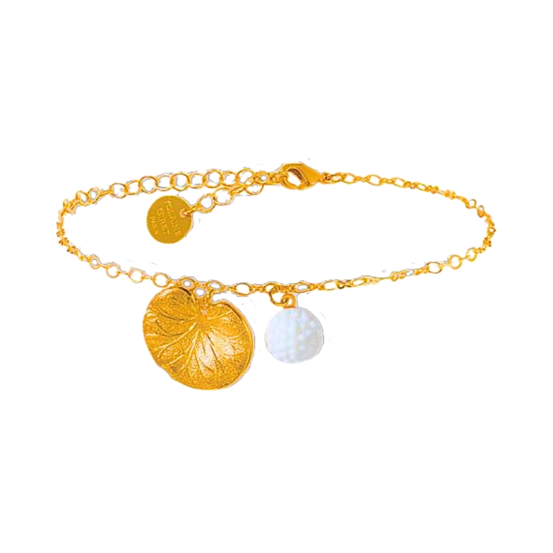 Trage das strahlende und elegante Nymphéas Grigri-Armband, bestehend aus einem Stück emailliertem Porzellan und einem Seerosenblatt im Jugendstil-Stil, das an einer zarten Goldspitzenkette befestigt ist. Dieses einzigartige Schmuckstück wurde vollständig in Frankreich handgefertigt und schmiegt sich perfekt an dein Handgelenk an.