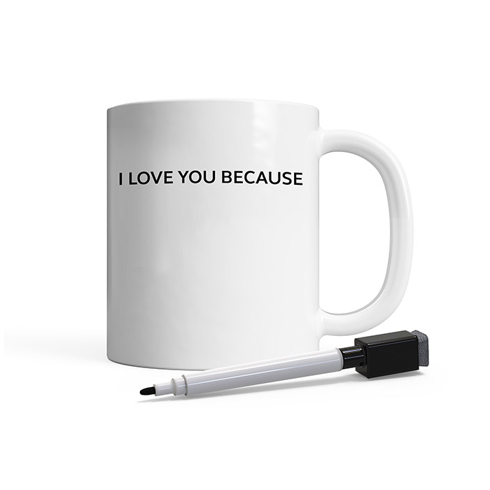 Der "I Love You Because" Kaffeebecher ist mehr als nur eine Tasse - er ist eine tägliche Erinnerung an die Liebe und Zuneigung, die du für jemanden empfindest. Mit einem abwaschbaren Stift inklusive hast du die Möglichkeit, jeden Tag einen neuen Grund zu nennen, warum du jemanden liebst. Dieser besondere Kaffeebecher ermöglicht es dir, deine Gefühle kreativ auszudrücken und eine persönliche Note in den Alltag zu bringen. Hergestellt aus hochwertigem Porzellan, ist dieser Becher nicht nur praktisch, sondern auch ein stilvolles Accessoire für deine Küche.