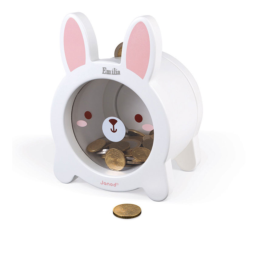 Kinder ab 3 Jahren werden diese grosse Hasen-Kässeli aus Holz lieben, denn sie wird ihre Münzen wie einen echten Schatz sicher verwahren! Durch die transparente Vorderseite kann man sehen, wie sich die Münzen und Geldscheine im Laufe der Zeit vermehren. Und nichts ist einfacher, um auf die Ersparnisse zuzugreifen! Man öffnet einfach die magnetische Klappe auf der Rückseite, die sich genauso leicht wieder verschliessen lässt. Die grossen rosa Ohren unseres Freundes und seine süsse kleine Schnauze machen Lust auf das Sparen!