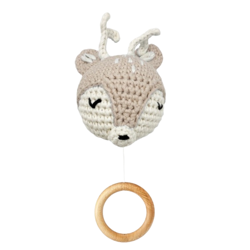 Entdecke dieses süsse und einzigartige Spieluhr-Reh, das mit Liebe von Hand aus Bio-Baumwolle gestrickt wurde. Mit zarten Strickdetails und einer beruhigenden Melodie spielt es "Twinkle, Twinkle, Little Star" und ist perfekt, um deinem Baby eine sanfte Schlafbegleitung zu bieten.