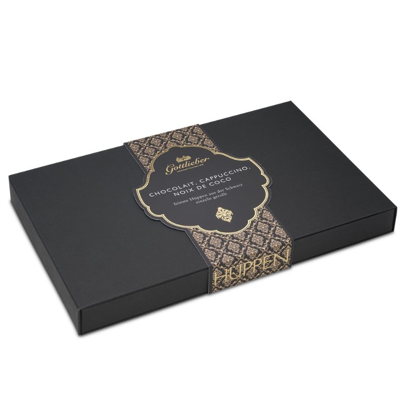Erlebe puren Genuss mit unserer exklusiven assortierten Mischung der drei Royal Edition Hüppen-Varianten Chocolait, Cappuccino und Noix de Coco, jetzt auch als grande in einer edlen Geschenkverpackung erhältlich. Die hochwertige Verpackung besticht durch ein elegantes und verspieltes Design sowie eine angenehme Haptik. öffne das Geschenk und entdecke feinste Milchschokolade, aromatischen Cappuccino und exotische Kokosnuss in jeder Hüppe – einzeln gerollt und gefüllt, jedes Stück ein kleines Meisterstück, das es zu geniessen gilt.
