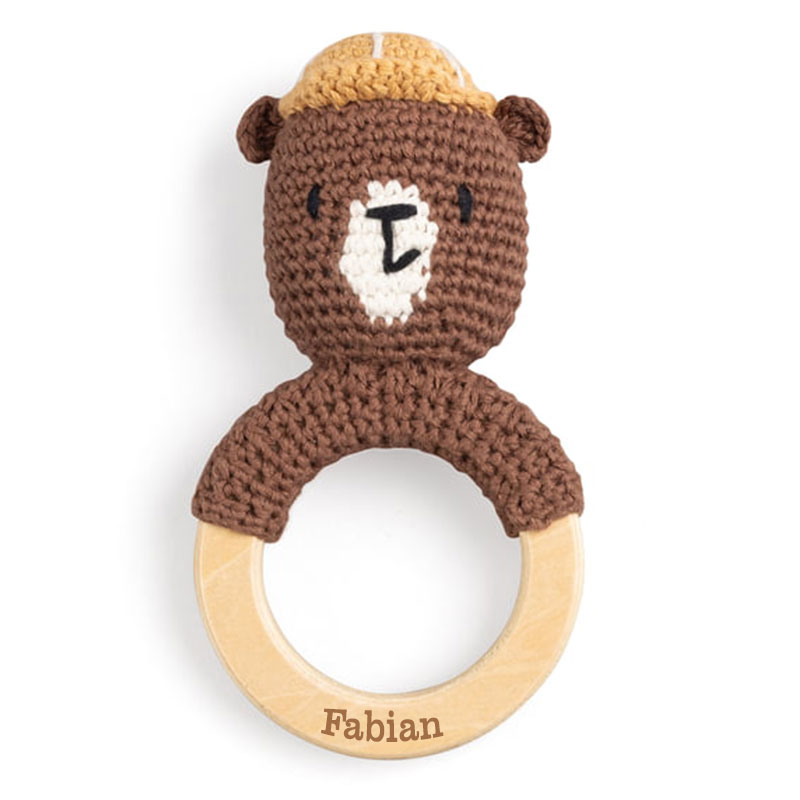 Diese personalisierte Häkel-Rassel ist ein weiches Spielzeug, das aus 100% Baumwolle gehäkelt und mit Polyester gefüllt wird. Der Bär ist auf einem Holzring angebracht, welcher auch von Kleinkindern schon sehr gut gegriffen werden kann. Im Inneren der Rassel ist ein kleines Glöckchen verborgen, welches dabei hilft, den Gehörsinn des Kindes sowie das Verständnis für Bewegungen zu fördern. Die Rassel ist ein tolles Geschenk für die Babyparty oder zur Geburt.