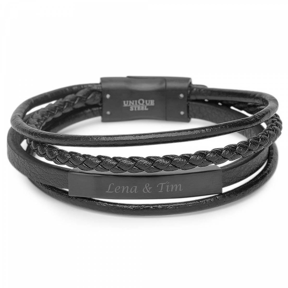 Unser schwarzes Kunstlederarmband verkörpert Stil und Individualität. Ausgestattet mit Gravurplatte, die du mit deinem Namen personalisieren kannst und einzigartigen Strähnen ist dieses schicke Accessoire ist speziell für dich gestaltet. Trage es und unterstreiche deine Persönlichkeit mit Eleganz und Raffinesse.