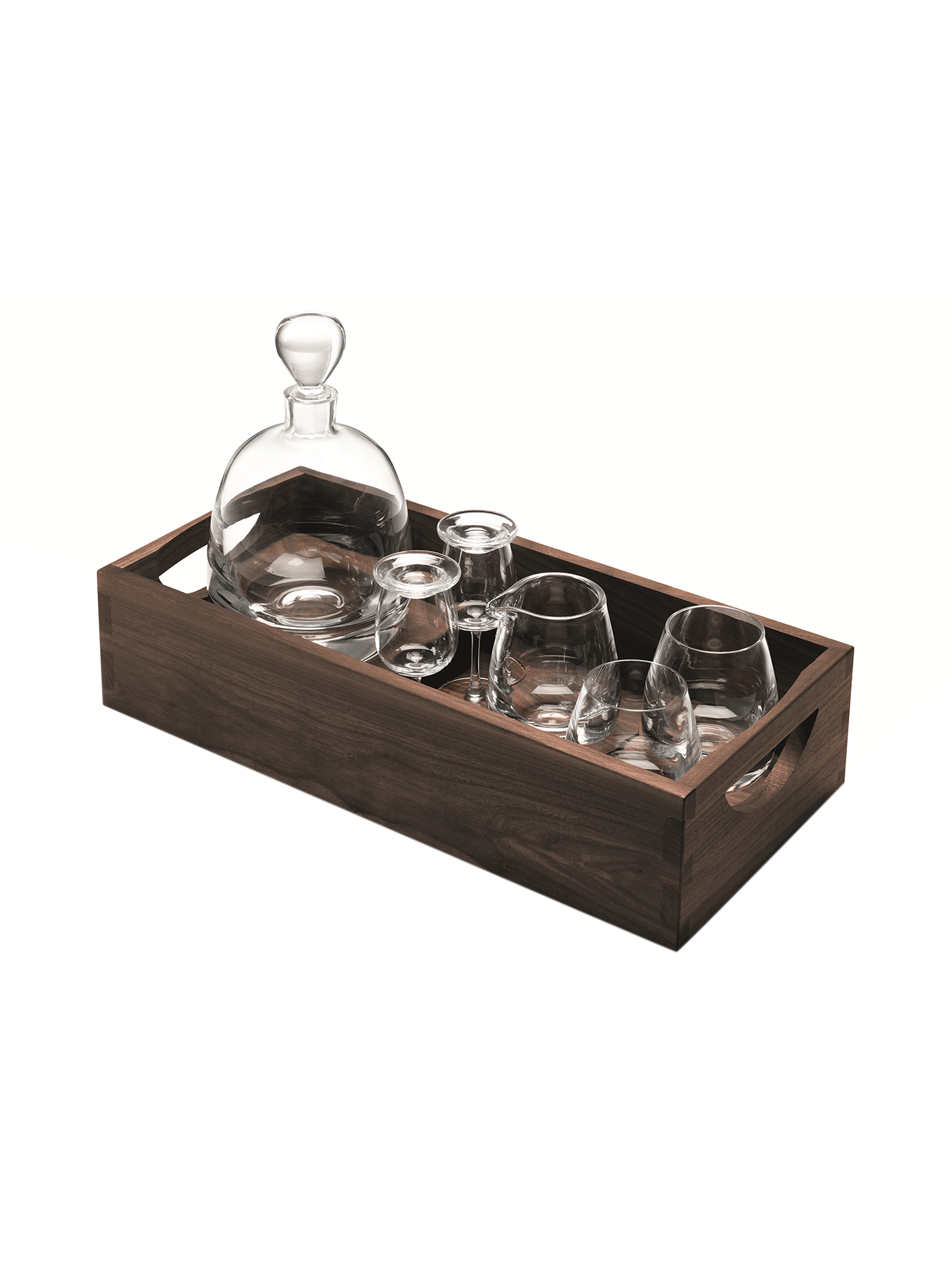 Das Set besteht aus zwei Bechern, Nosing-Gläsern mit Deckeln und Untersetzern aus Walnussholz. Dieses Meisterwerk wurde mit Hilfe von Glasbläserkunst von Hand geformt.