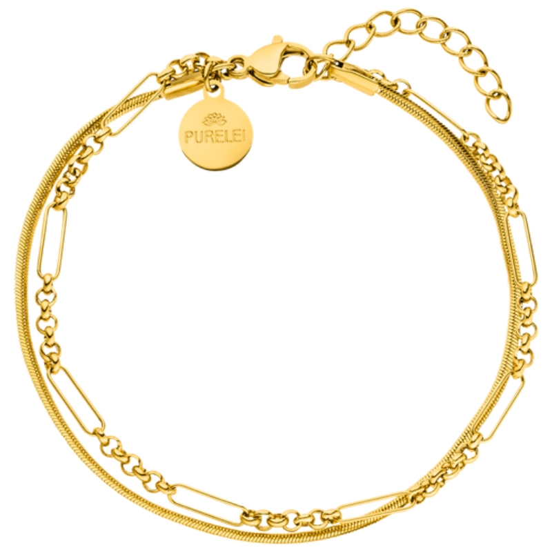 Finde mit den zweireihigen Armband Unison von Purelei das ideale Schmuckstück für jede Sammlung. Die goldenen Kettchen in zweierlei Stilen geben deinem Outfit den letzten Schliff. Hergestellt aus hochwertigem 18K vergoldetem Edelstahl wird dieses Armband dir lange Freude bereiten und zeugt von für zeitloser Eleganz.