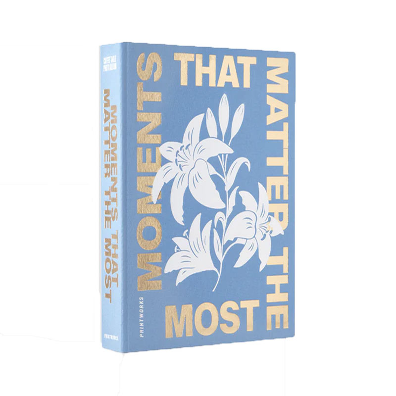 Versinke in der Welt der Erinnerungen mit diesem Fotoalbum "Moments that Matter the Most". Hinter dem eleganten himmelblauen Stoffeinband mit geprägten goldenen Text verbergen sich 30 Seiten hochwertigen weissen Fotopapiers auf dem du deine Fotos mühelos befestigen kannst und die zusätzlich Platz für persönliche Anekdoten und Texte bieten.