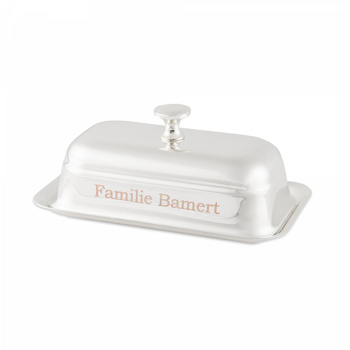 Eine personalisierte versilberte Butterdosen sind nicht nur praktisch, sondern dient auch als stilvolles Dekorationselement! Die praktische Grösse eignet sich ausgezeichnet für 180g Vorzugsbutter. Die Dose gehört zur Grundausstattung eines jeden Haushalts und passt sich harmonisch jedem Einrichtungsstil an – egal ob traditionell oder zeitgemäss.