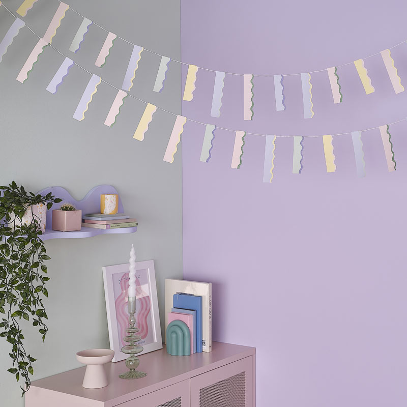 Erwecke das Pastell-Thema zum Leben mit dieser Pastellfarbenen Wimpelkette. Jede Papiergirlande ist 5 m lang und sorgt für eine fröhliche Atmosphäre. Kombiniere diese witzige Girlande mit anderen pastellfarbenen Partydekorationen aus derselben Kollektion, um frischen Wind in deine Einrichtung zu bringen.