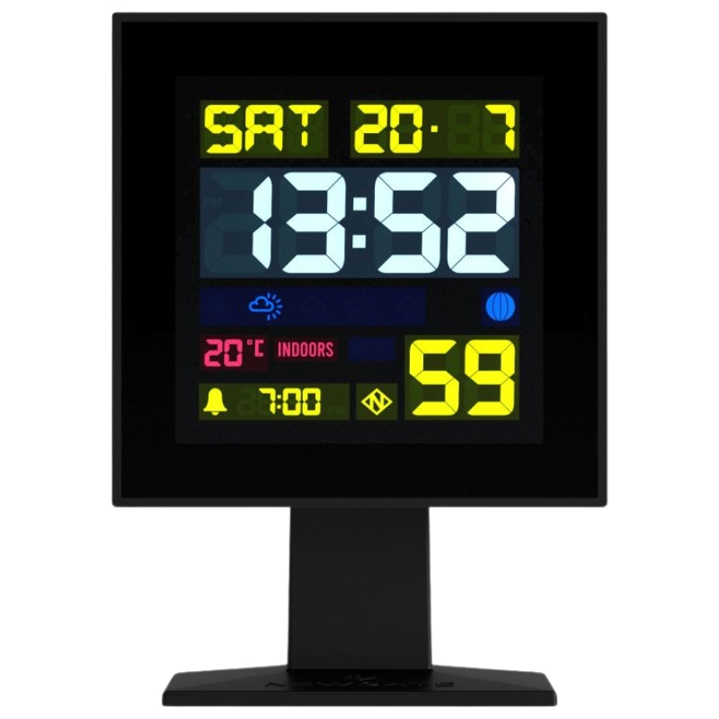 Mit einem eckigen schwarzen LCD-Bildschirm auf einem quadratischen Ständer präsentiert sich der digitale Multifunktions-Retro-Wecker und zeigt lebhafte farbige Ziffern an. Durch sein innovatives Design vereint dieser Wecker Retro-Charme mit moderner Funktionalität und bietet eine Vielzahl von Funktionen, darunter eine Anzeigemöglichkeit im Format von entweder 12 oder 24 Stunden.