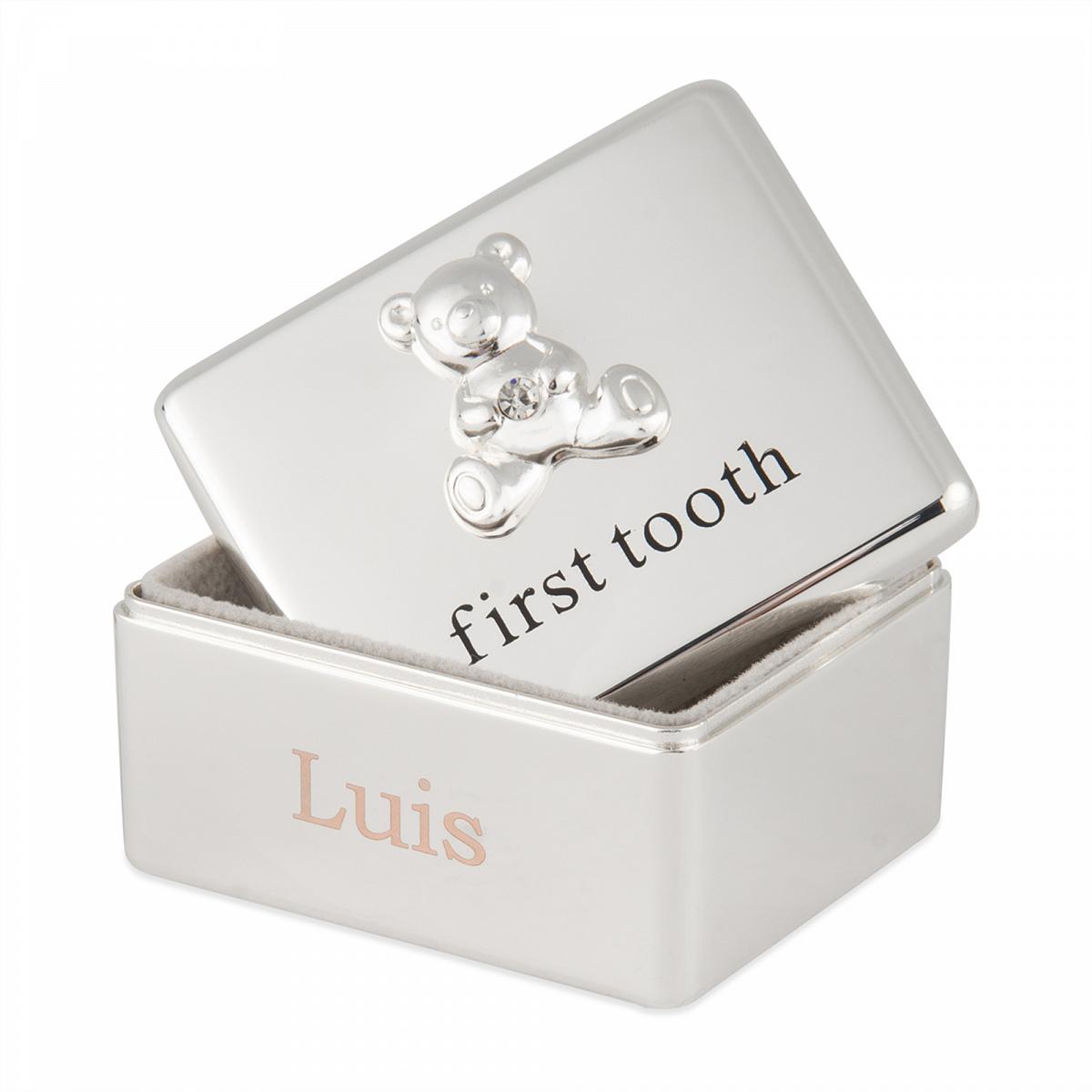 Die personalisierte Babydose "first tooth" eignet sich perfekt zum Aufbewahren ganz besonderer Erinnerungen. Die versilberte Lockenbox ist mit einem glänzenden Teddy und dem Schriftzug 'my first tooth' verziert und lässt sich nach deinen Wünsche gravieren. Ein zeitloses Geschenk für neue Eltern, um die erste Locke ihres Babys auf elegante Weise aufzubewahren.