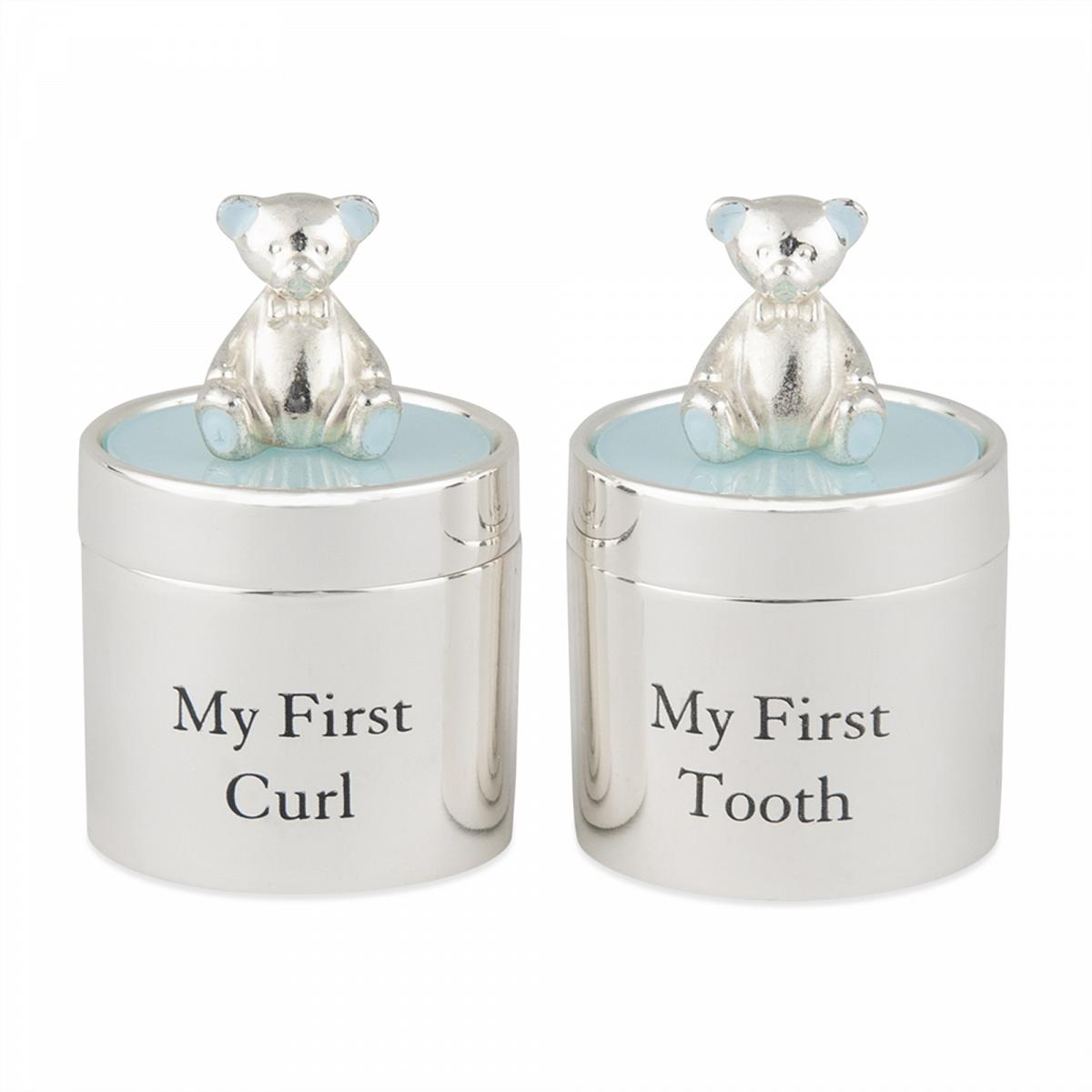Die versilberten Babydosen mit Teddy-Design sind ein zeitloses Geschenk für frischgebackene Eltern, um die wertvollen Erinnerungen ihrer Neugeborenen stilvoll aufzubewahren. Die zwei Behälter haben babyblau lackierte Deckel und sind mit 'my first tooth' und 'my first curl' beschriftet. Durch eine persönliche Gravur auf der Rückseite machst du das Set zu einem einzigartigen Erinnerungsstück für die Ewigkeit.