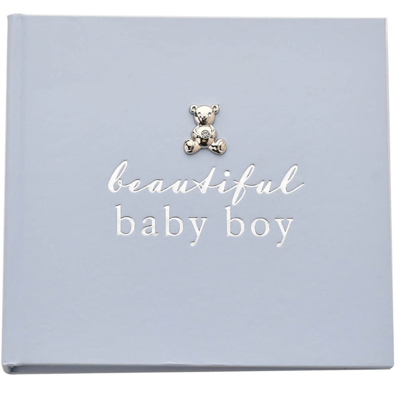 Halte die wundervollen Erinnerungen deines neugeborenen Sohnes in diesem entzückenden Fotoalbum fest. Das babyblaue Cover ist mit dem glänzenden Schriftzug 'Beautiful Baby Boy' und einem silbernen Teddy-Symbol verziert. Vom ersten Wort bis zum ersten Schritt wird euch dieses Album auf der gemeinsamen Reise begleiten und zu einem zeitlosen Andenken.