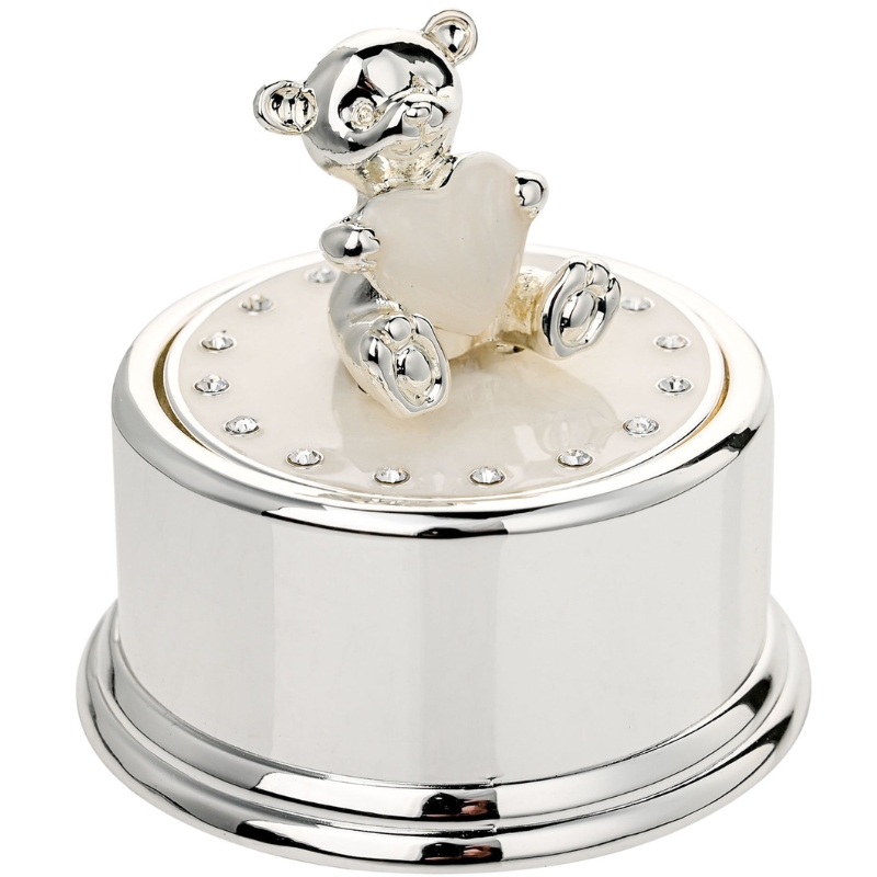 Begib dich in die Welt des zauberhaften Teddys und der versilberten runden Spieluhren. Hergestellt aus hochwertigem versilbertem Metall, verströmt diese Musikdose mit ihrem glänzenden Finish Eleganz und Charme. Ein entzückender Teddybär sitzt auf dem Herzen der Spieluhr, das er mit seinen Pfoten umschliesst.