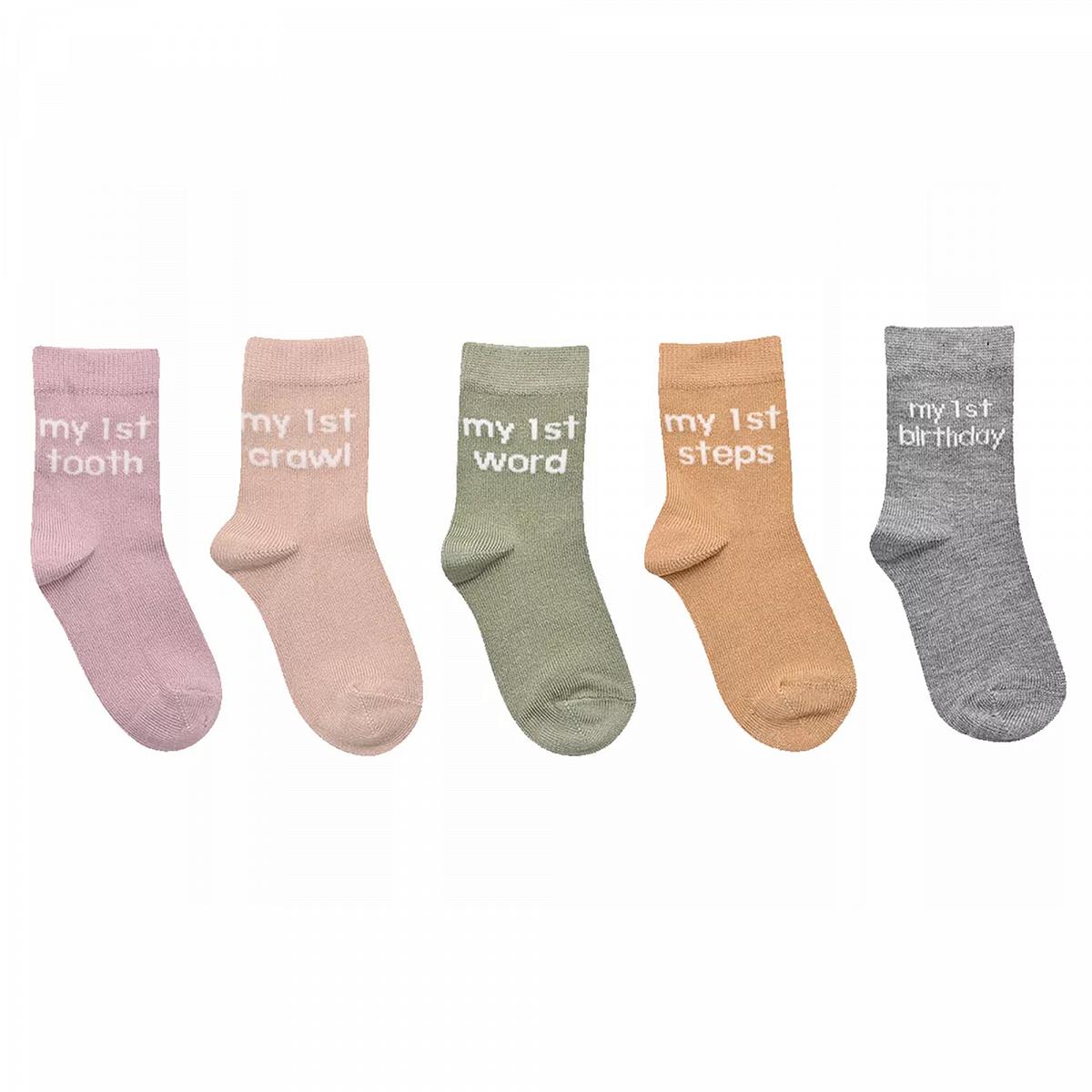 Zelebriert jeden speziellen Augenblick des kleinen Schatzes mit den Baby-Socken "My First Milestones". Diese niedliche Kollektion mit soll die ersten wichtigen Schritte im Leben des neuen Familienzuwachses festhalten. Jedes der 5 Paar Socken bringt Farbe in die Garderobe deines Babys und erinnert an diese frühen Erfolge.