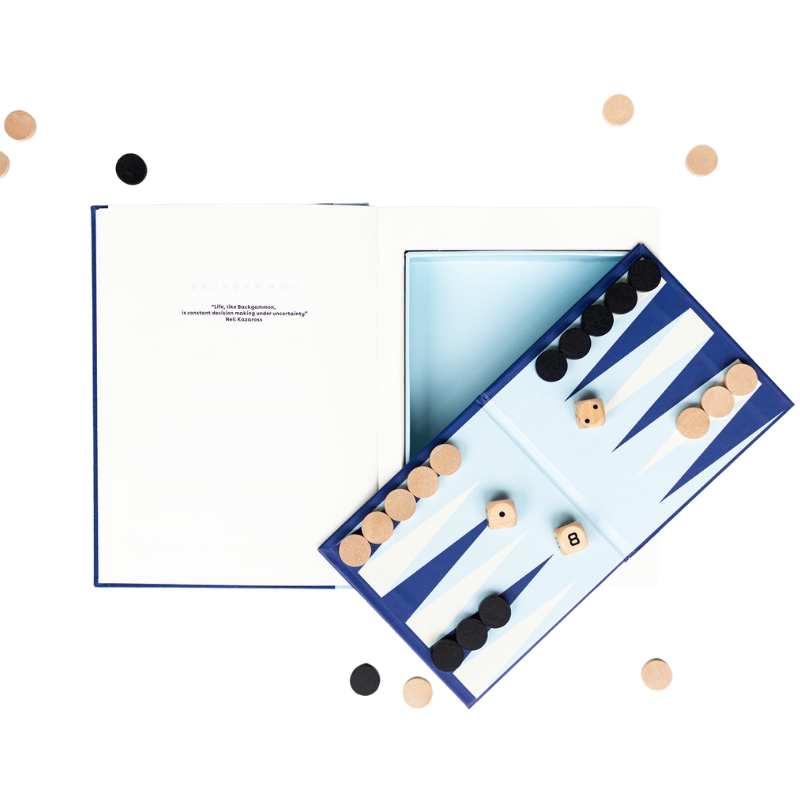 Ein Hardcover-Buch, das ein komplettes Spielset enthält, mit Brettspiel, Würfeln und Spielsteinen, die clever zwischen den Seiten versteckt sind. Nach dem Spielen kannst du das Set dekorativ auf deinem Bücherregal oder Couchtisch ausstellen und so alle Blicke auf sich ziehen.