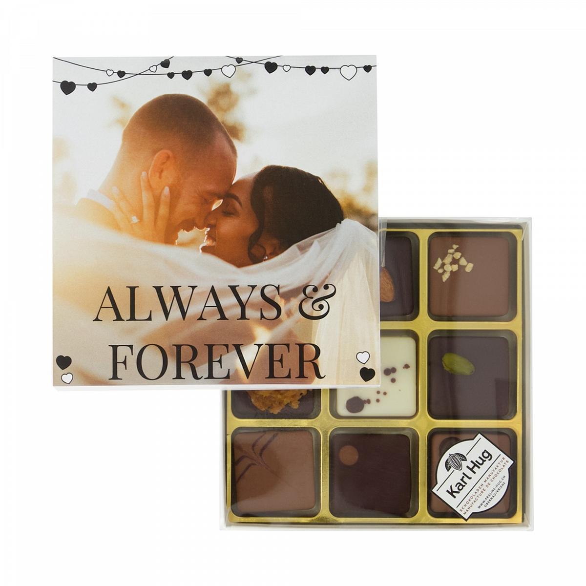 überrasche deine Liebsten mit einer personalisierten Pralinenbox im 9er Set. Die edle Box kann mit einem Foto oder Text deiner Wahl gestaltet werden, was sie zu einem exklusiven und einzigartigen Geschenk macht. Die Premium Pralinen einer Schweizer Schokoladen Manufaktur sind aus hochwertiger Schokolade in verschiedenen Sorten, perfekt für besondere Anlässe oder einfach, um jemandem eine Freude zu bereiten! Die Karl Hug Schokoladen Manufaktur produziert im Kanton Luzern feinste Schweizer Schokolade aus fairem Handel.