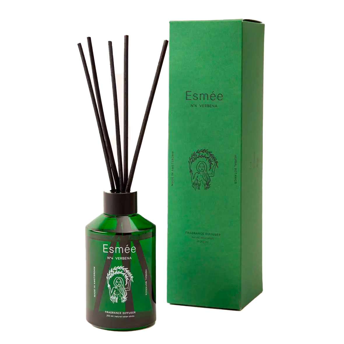 Der Duft Diffuser N°4 Verbena verleiht deinem Zuhause eine erfrischende und wohltuende Atmosphäre mit seinem belebenden Duft krautiger Botanik, der sich durch deine herbalen Noten auszeichnet. Handgefertigt in Amsterdam, besticht er durch sein auffälliges Design in einer stilvollen, grünen Glasflasche mit einzigartigen Illustrationen. Perfekt als Geschenk oder um sich selbst zu verwöhnen, bringt der Diffusor stilvolle Eleganz und eine beruhigende Duftkomposition in jedes Interieur.
