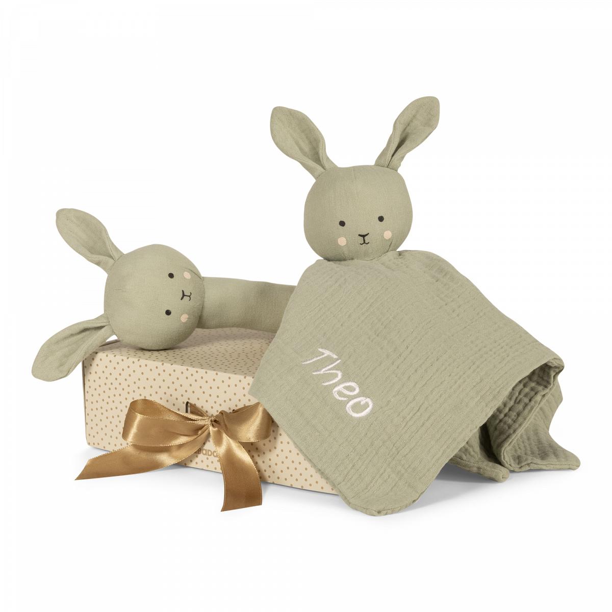 Personalisierte Schmusedecke & Rassel Hase salbei