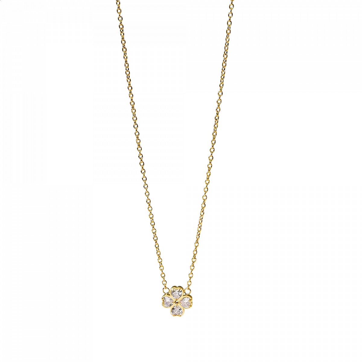 Die Purelei Cuore Kette in Gold bezaubert mit ihrem filigranen Anhänger, der ein vierblättriges Kleeblatt aus funkelnden herzförmigen Zirkonia-Steinen darstellt. Dieses besondere Design verleiht jedem Look eine charmante und elegante Note. Ein perfektes Geschenk für Schmuckliebhaber, die Glückssymbole und stilvolle Details schätzen.