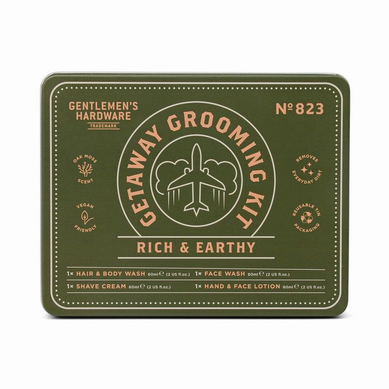 Das Getaway Grooming Kit von Gentlemen’s Hardware ist der ideale Begleiter für Reisen oder unterwegs. Das kompakte Set enthält alles, was du für eine gepflegte Erscheinung benötigst: 3-in-1-Waschgel, Rasiercreme, Gesichtsreiniger und Hand- und Gesichtslotion – alles in einer praktischen, wiederverwendbaren Metalldose. Mit veganen Inhaltsstoffen und dem beruhigenden Duft von Eichenmoos ist es das perfekte Geschenk für gepflegte Männer.