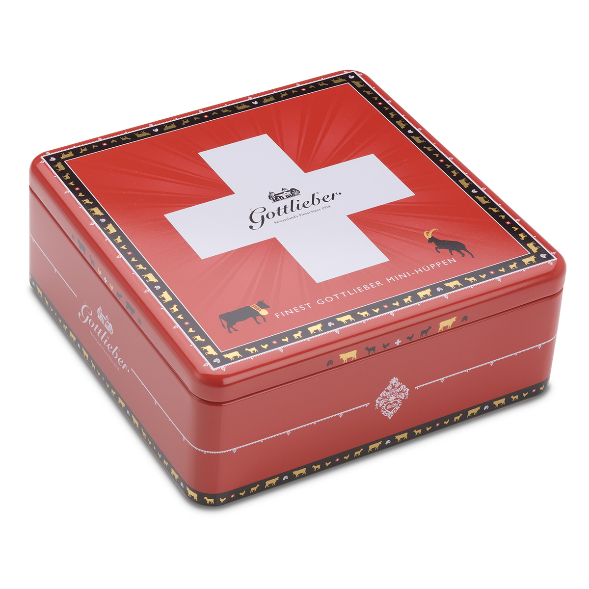 Das Gottlieber Schmuckdose Schweiz II ist eine stilvolle Metalldose, inspiriert von den Schweizer Alpen, die Gottlieber Hüppen-Spezialitäten enthält. Die Dose ist ein wunderschönes Sammlerstück und eine ideale Geschenkidee, um die handgemachten Hüppen mit ihren verschiedenen Füllungen stilvoll zu präsentieren. Perfekt, um Schweizer Tradition und Süssgenuss zu verbinden.